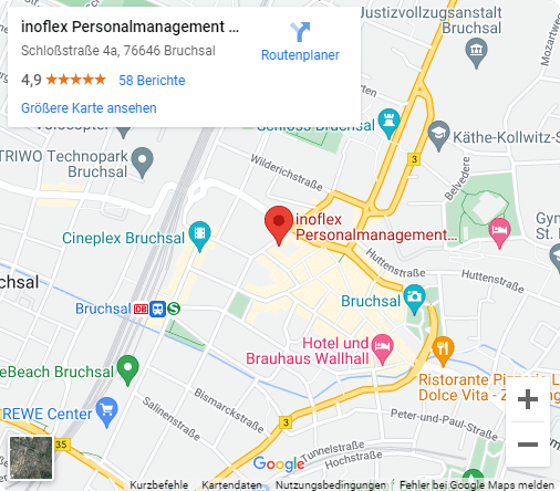 Willkommen bei inoflex in Bruchsal, Ihrem Wegbereiter für eine erfolgreiche berufliche Zukunft in der dynamischen Region zwischen Rhein und Neckar. In der historischen Stadt Bruchsal, die nicht nur durch ihr beeindruckendes Barockschloss, sondern auch durch ihre lebendige Wirtschaft bekannt ist, bietet inoflex individuelle Karrierewege und verbindet qualifizierte Talente mit führenden Unternehmen.